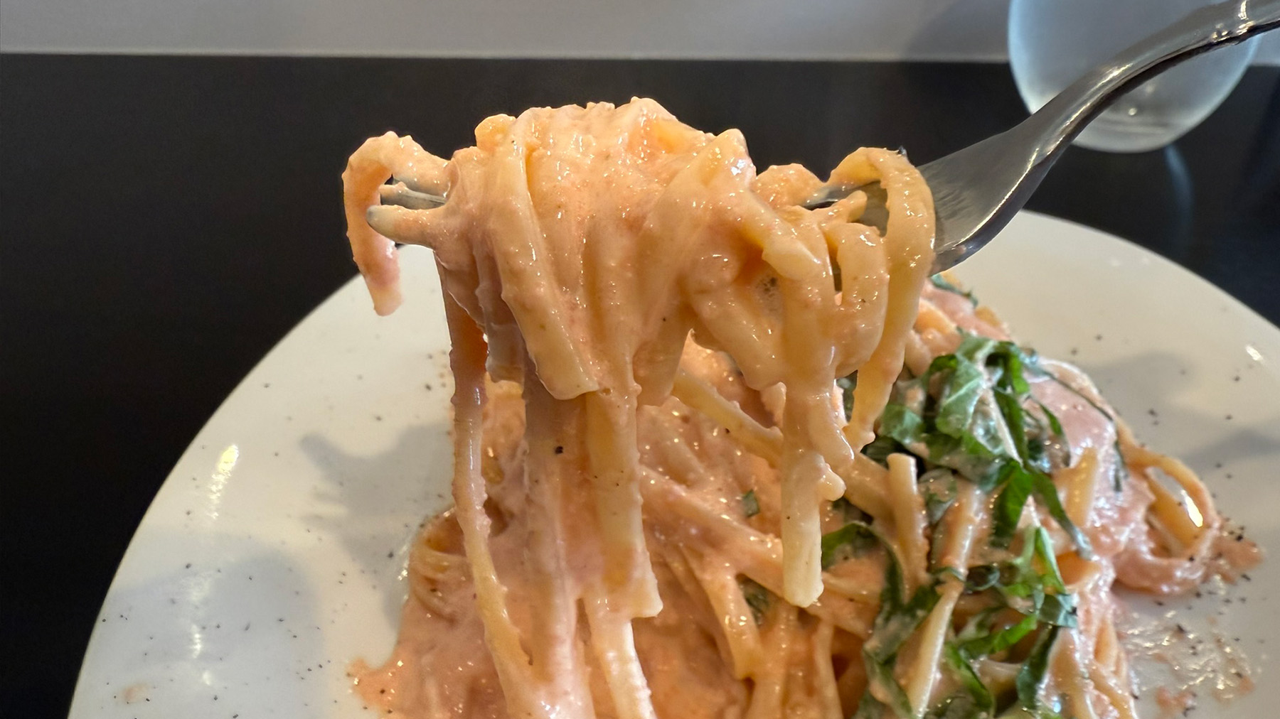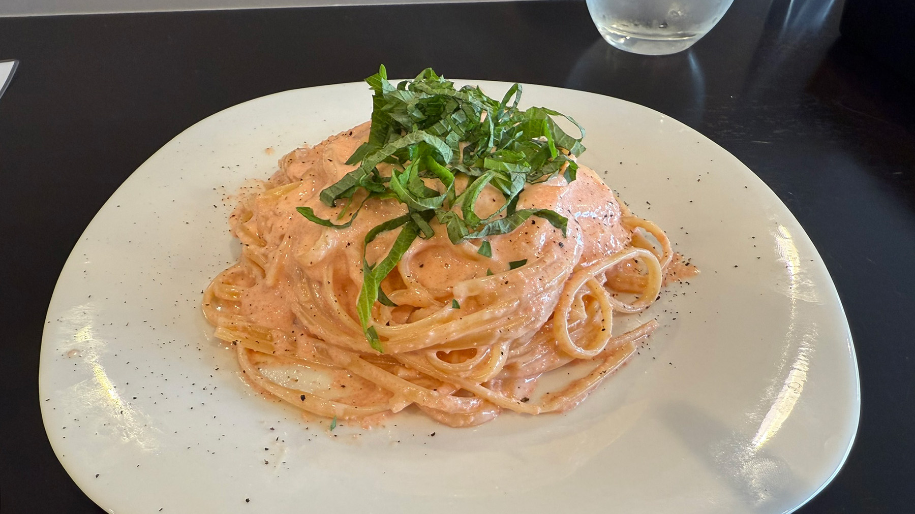 仕事のお昼休憩に来たのでさすがにボンゴレガーリックは午後からテロになってしまいますので、明太クリームパスタ1200円を注文してみました